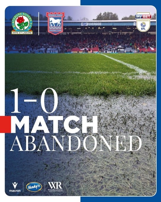 布莱克本凭借坎特维尔的点球以1-0领先,且比赛仅剩11分钟,伊普斯维奇的雅各布-格雷夫斯还被红牌罚下。但由于暴雨侵袭,比赛被迫取消,工作人员无法将球场恢复到可比赛状态。