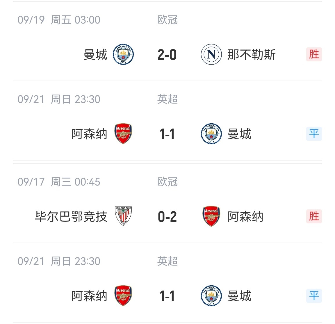 曼城9月19日3点主场2-0那不勒斯,9月21日23点30客场挑战阿森纳,两场比赛的开球时间间隔了2天20个小时30分钟。
